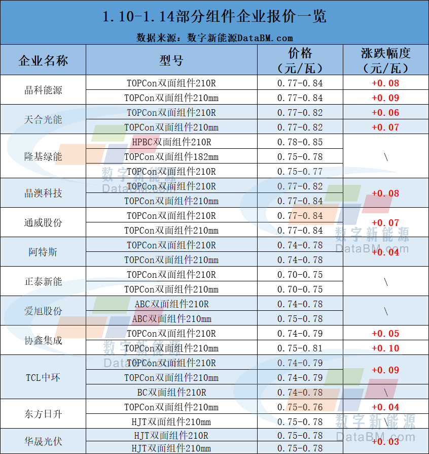 据数字新能源DataBM.com调研统计,已有11家组件厂商于近5日迅速行动,价格上调0.04-0.10元/W,对应常规组件每块价格上涨50-70元不等。